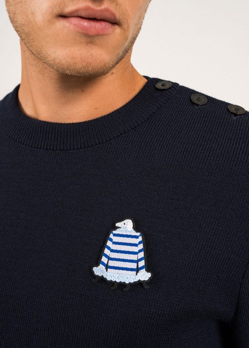 On aime son design décalé, référence à l’univers SAINT JAMES ; un mouton portant un pull rayé.