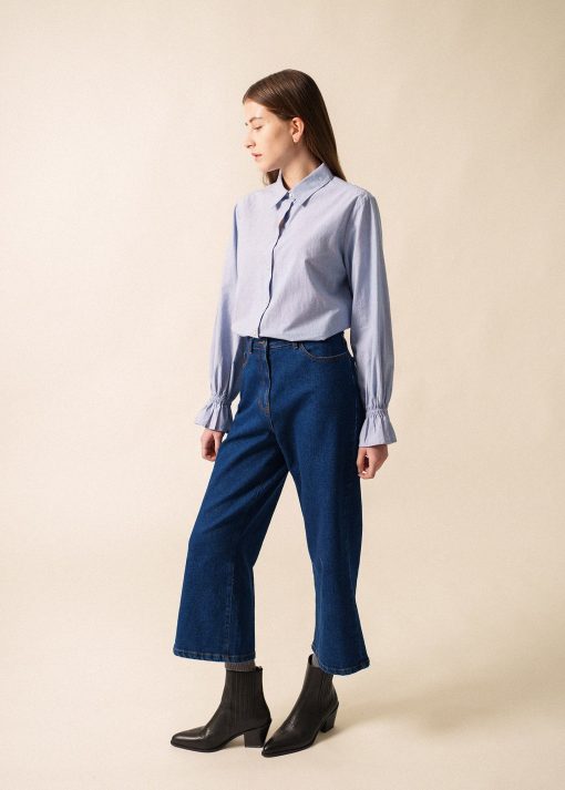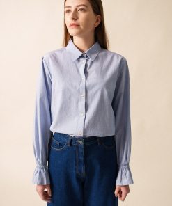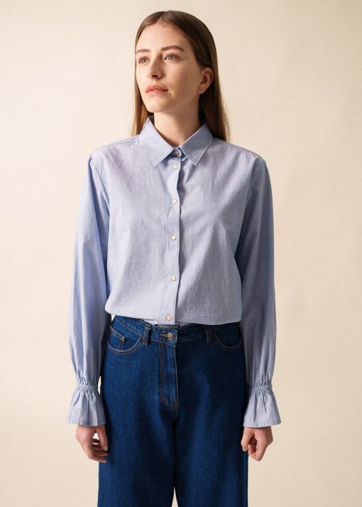 La Chemise Céleste se caractérise par son tissu en fil à fil, confectionné à partir de 100% coton. Elle présente des manches volantées élastiquées qui ajoutent une touche de féminité à son design. Sa coupe droite assure un ajustement confortable et moderne, convenant aussi bien à des tenues professionnelles qu’à des occasions décontractées.
