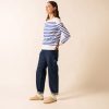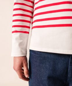 Intemporel, le modèle Naval reprend les codes de la marinière emblématique : rayures en empiècement d’un bleu « gitane » sur fond blanc, encolure « esprit bateau » et fentes côté. Elle est ici twistée par une rayure rouge contrastée, qui apporte dynamisme et originalité à la pièce.- Marinière