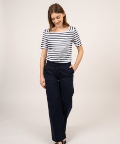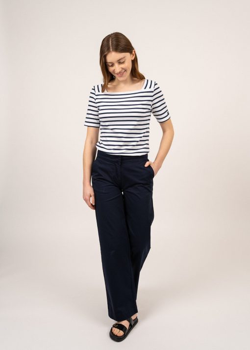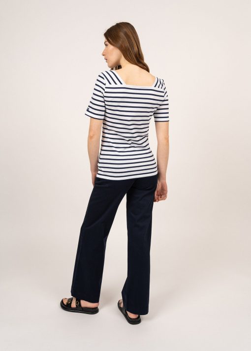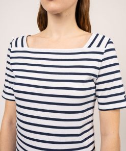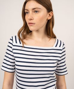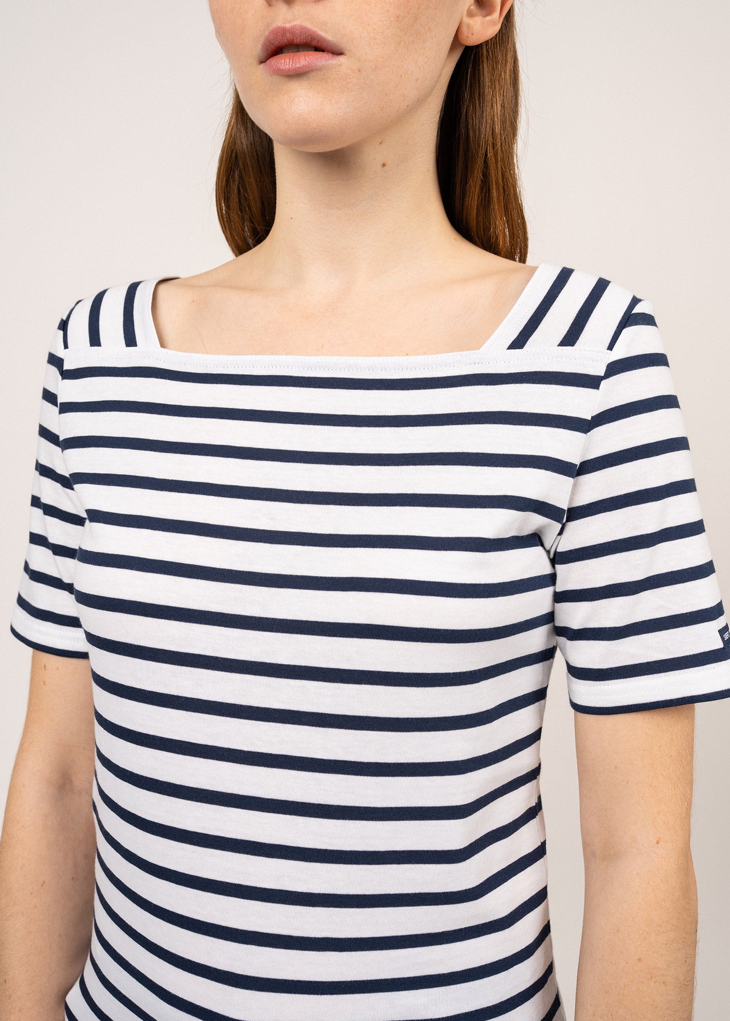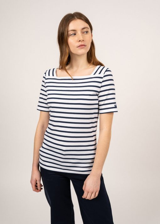 La marinière Pléneuf joue avec les codes de nos iconiques marinières : le col rond est remplacé par un col carré, et aux épaules un jeu de rayures verticales apportent une touche dynamique et originale à l’ensemble. Manches courtes, elle est idéale pour les beaux jours.- Marinière