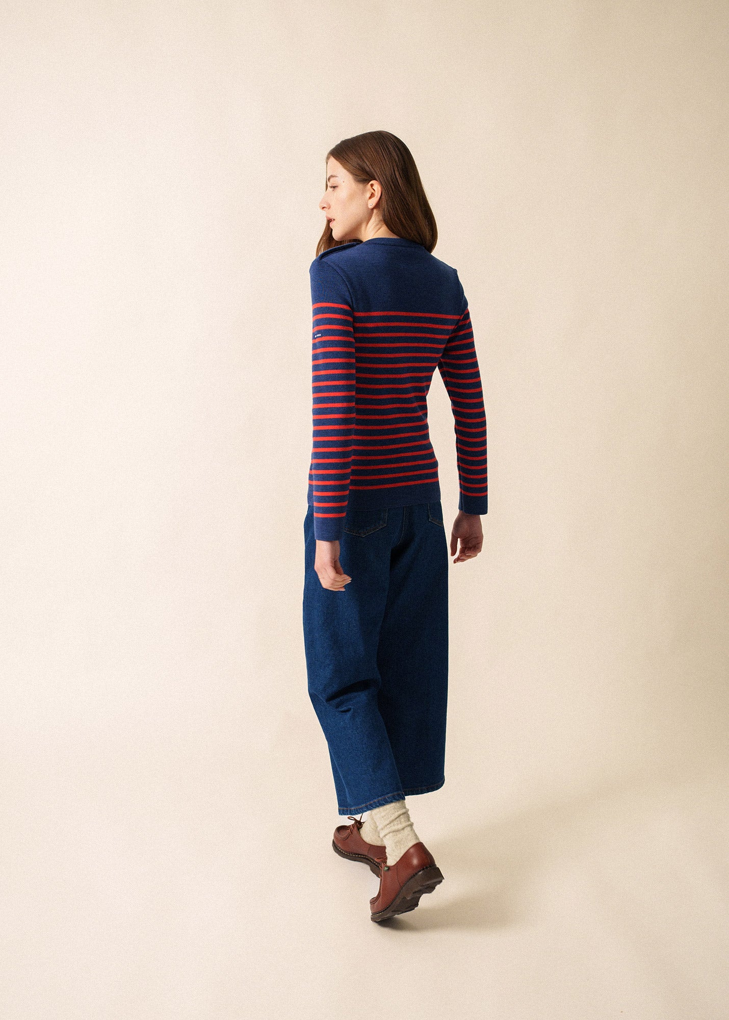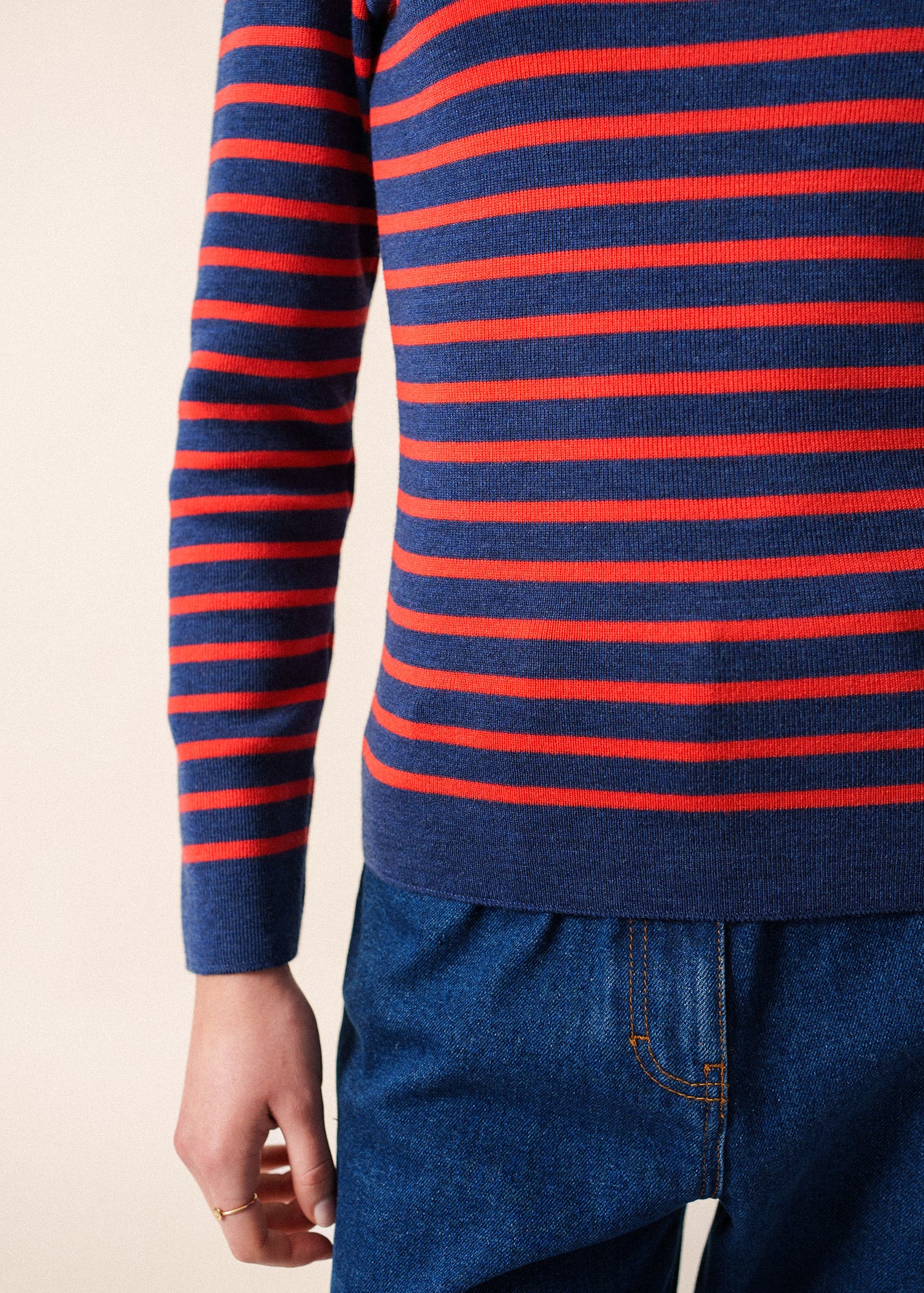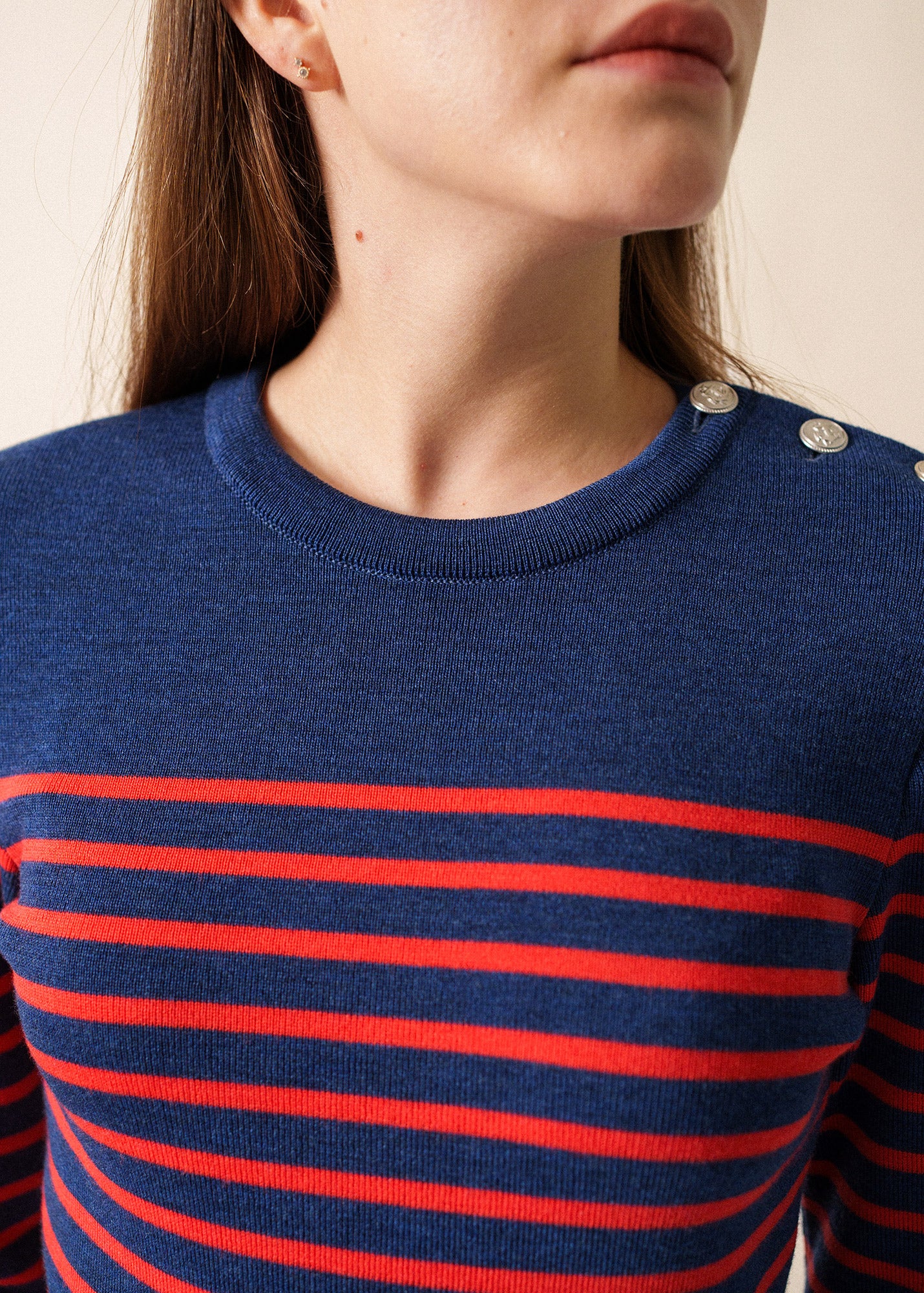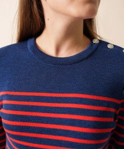 Pièce incontournable du vestiaire féminin SAINT JAMES, le pull Marée est une version féminine de notre iconique pull marin. Tricoté dans nos Ateliers dans une laine douce et fine, il est parfait pour celles cherchant à allier confort, chaleur et élégance. Intemporel, il reprend les codes centenaires de nos pulls marins : un col rond remaillé, un tricotage en côte 1×1, un boutonnage à l’épaule, une composition 100% laine vierge et une coupe près du corps, pour conserver chaleur et praticité. Versatile, il sera le meilleur allié de toutes vos tenues, habillées ou casual, classiques ou originales.