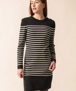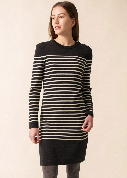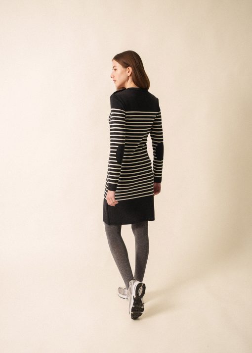 Tricotée dans nos ateliers et nouveauté pour cette saison, la robe Grande Marée rayée en laine de mérinos s’inspire du célèbre pull marin SAINT JAMES. Un classique élégant réinventé pour une silhouette féminine marine.- Robe