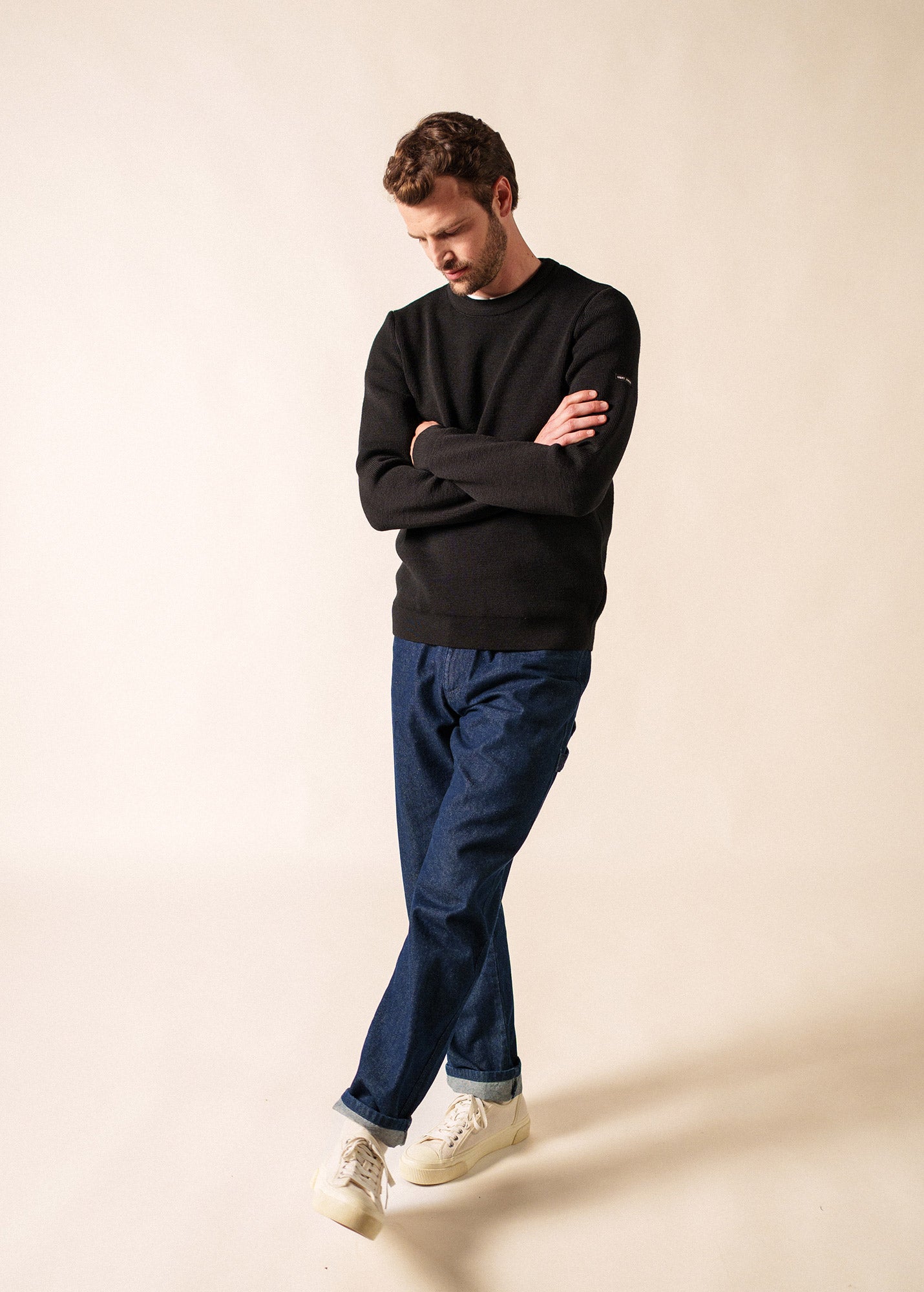 Mis en exergue par le tricotage sobre de son corps, le pull Locronan affirme sa singularité dans le dessin raffiné de son col : entre les sillons de côtes, des rayures obliques contrarient le sens établi pour créer un motif qui associe la délicatesse du travail de maille à la sobriété d’un ton sur ton.- Pull marin