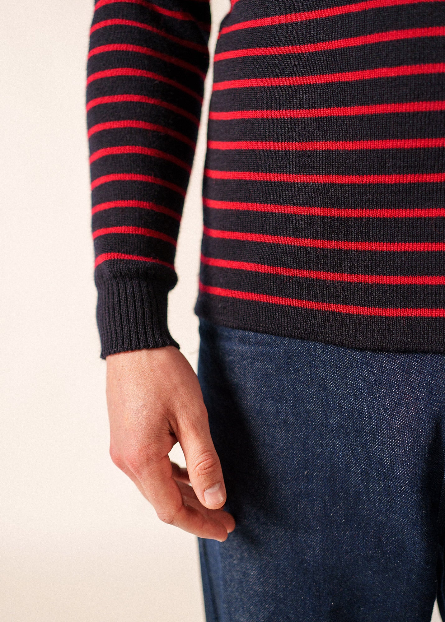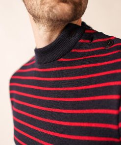 Incontournable, le pull marin est la pièce faisant la renommée de la maison SAINT JAMES. Le modèle Matelot, authentique, est fabriqué dans nos Ateliers normands, à Saint-James. Il regroupe les éléments traditionnel du chandail marin qui accompagnait les marins à Terre-Neuve : un tricotage très serré, qui le rend presque imperméable, un boutonnage à l’épaule gauche, pour faciliter son enfilage et maintenir le cou au chaud, une longueur permettant de protéger le dos lorsque l’on se baisse, et une composition 100% laine vierge non traitée.Décliné dans une version rayée, il s’inspire de nos traditionnelles marinières. Un modèle au look marin affirmé, à détourner et décliner en version citadine, urbaine ou mode.- Pull marin