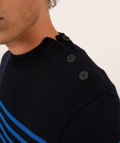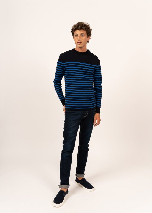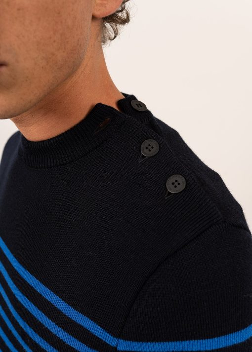 Modèle idéal de ceux aimant le charme du pull marin authentique mais recherchant plus de confort, le pull marin Rochefort est à la fois traditionnel et confortable. Confectionné en laine mérinos, il est doux, chaud, mais également respirant. Sa coupe reprend les codes du pull marin classique : un col rond remaillé, un boutonnage à l’épaule pour facilité l’enfilage, un tricotage en côte 1×1 et une longueur permettant de protéger le dos, même lorsque l’on se baisse.Décliné dans une version rayée, il apportera une touche marine supplémentaire à votre look, adoucie par son empiècement uni en haut de corps.- Pull marin