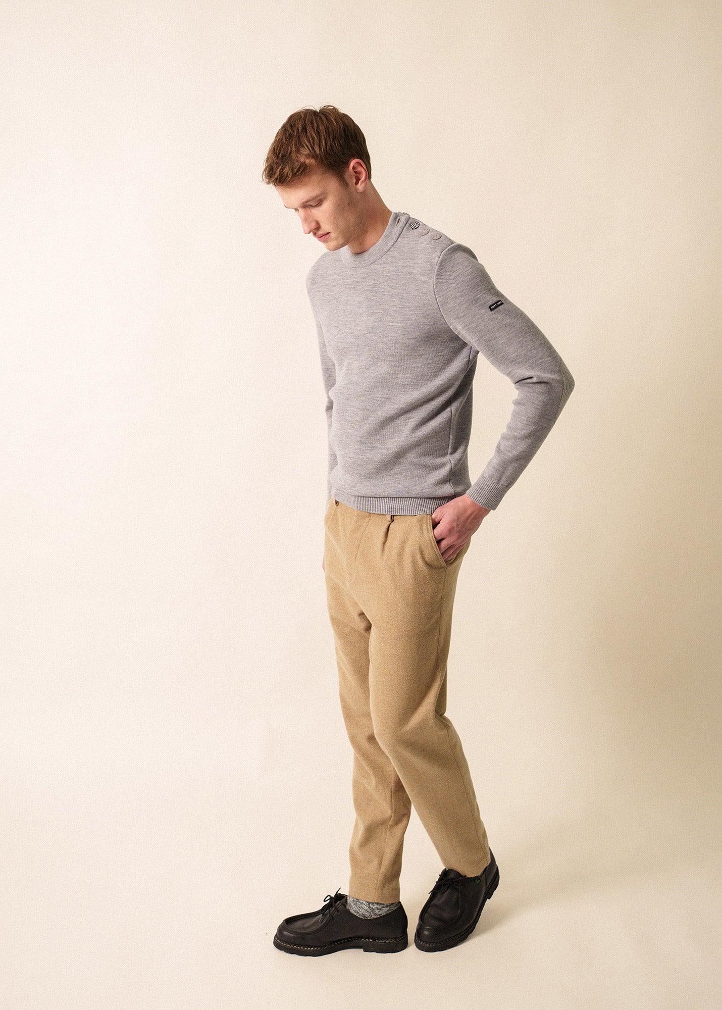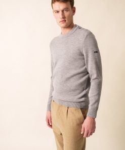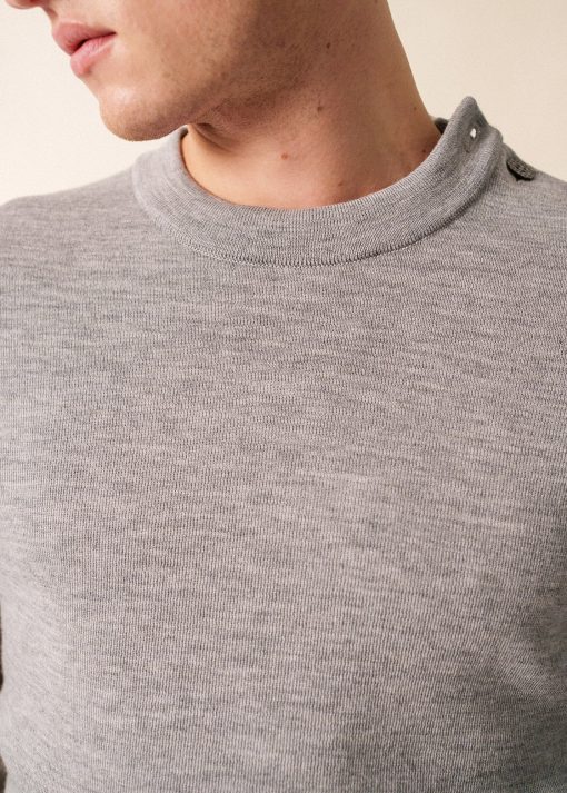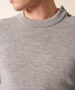 Pull col rond remaillé, en côte 1×1. Détails jacquard tricoté en coudière et gravé sur 1 bouton. Boutonnage sur une épaule. Bord-côte en bas de manches et bas de corps.