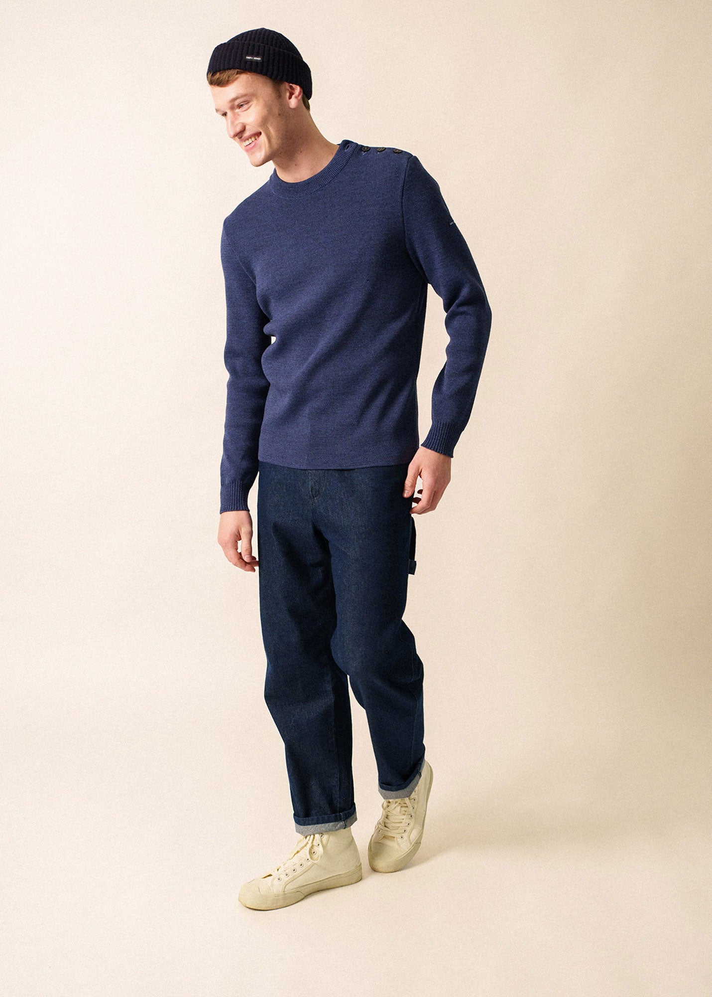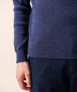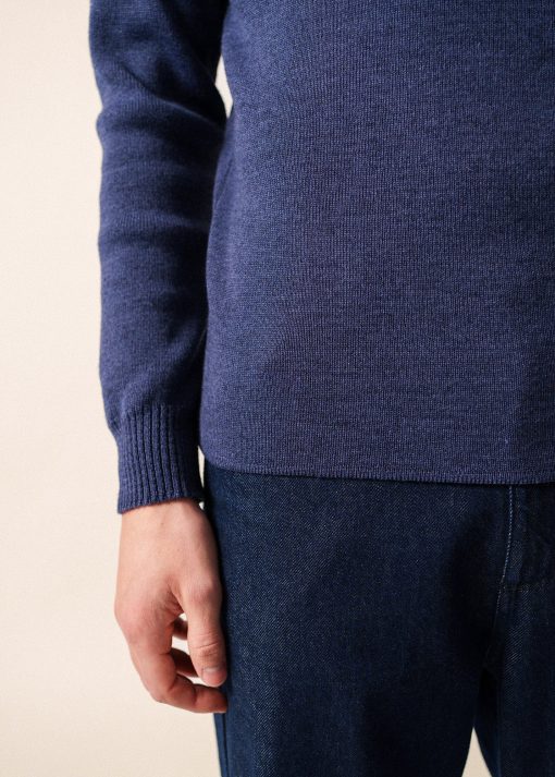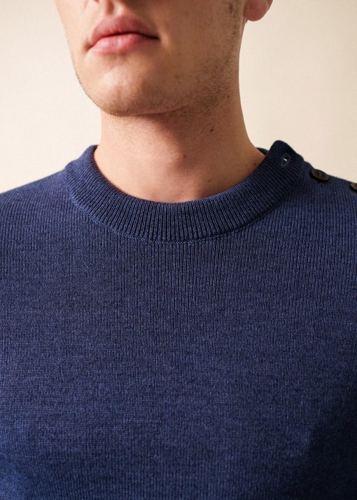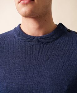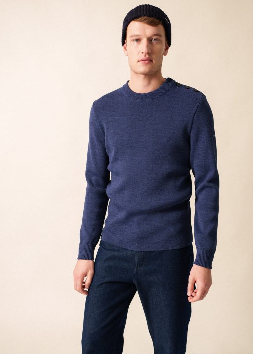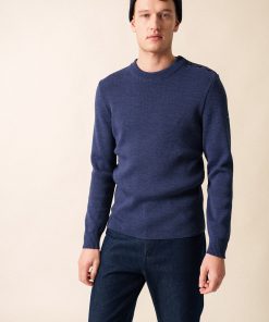 Pour ce pull à l’allure marine, la laine se mélange à de l’acrylique teflonée, ce qui améliore sa technicité : cette caractéristique facilite son entretien et agit comme un hydrophobe et rend la laine moins absorbante, un atout pour faire face aux caprices de la météo avec quiétude.