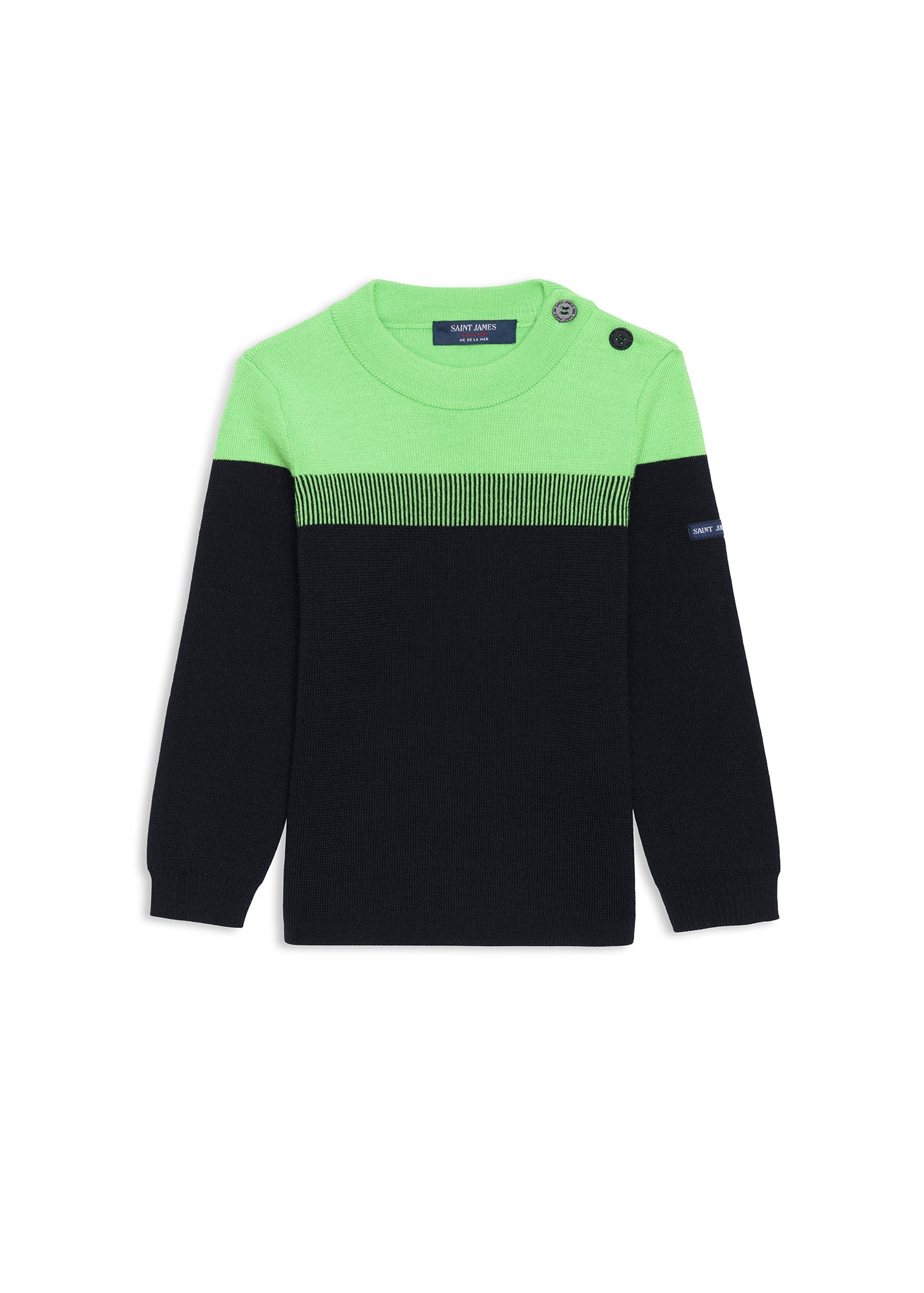 Version miniature de notre pull Bretagne, ce pull en laine mélangée est fait pour les matelots en herbe ! On aime son empiècement coloré en haut de corps, ainsi que ses détails caractéristiques des pulls marins traditionnels : le col rond remaillé, le boutonnage épaule et le bord-côte en bas de manche.- Côte 1×1